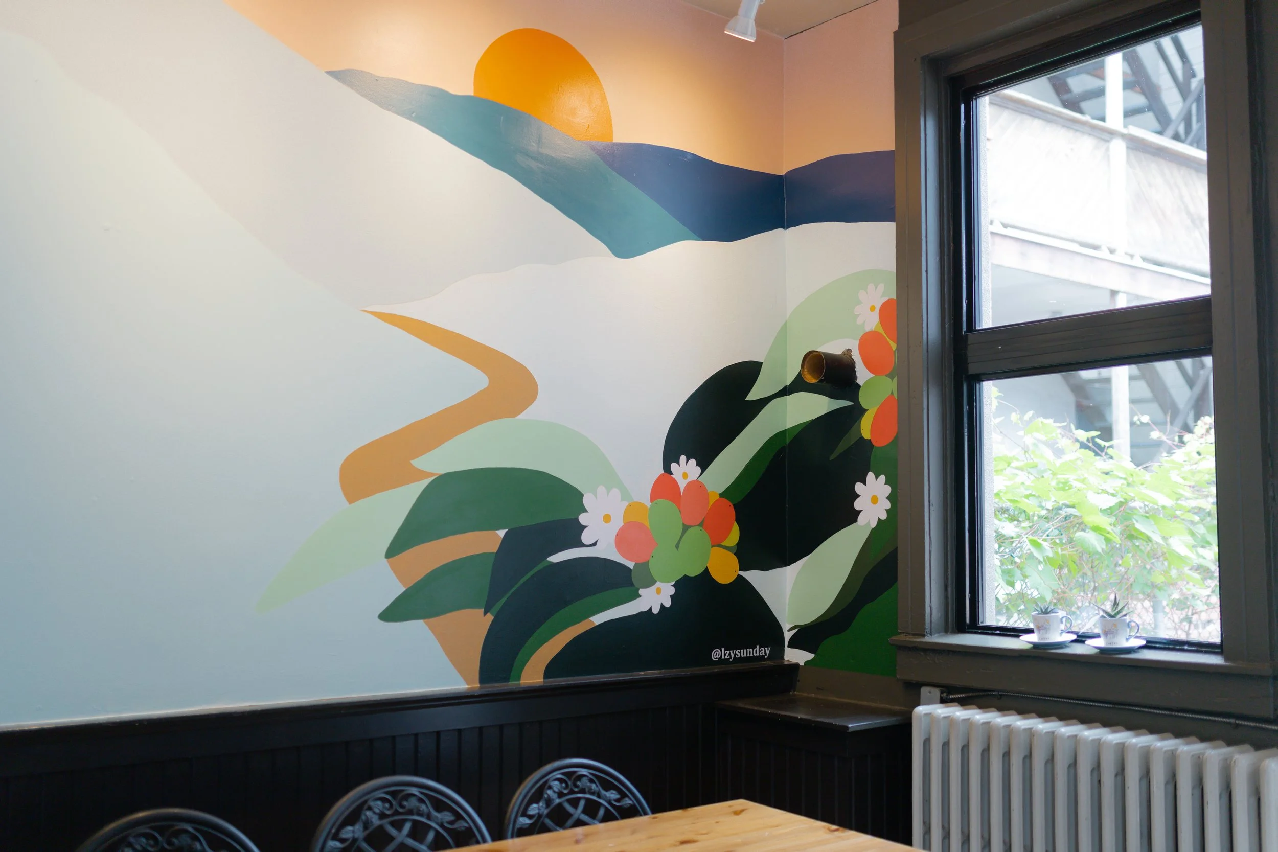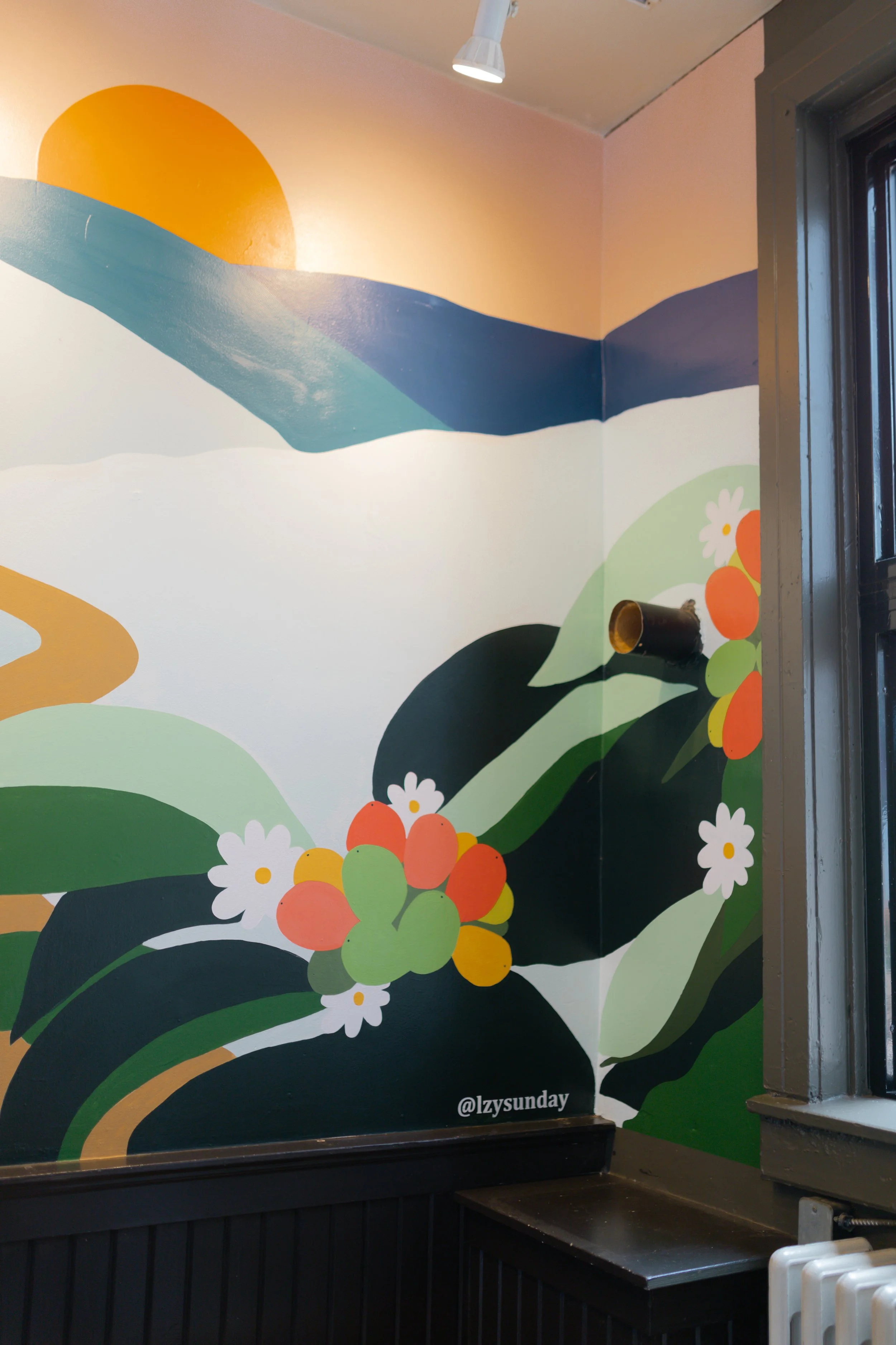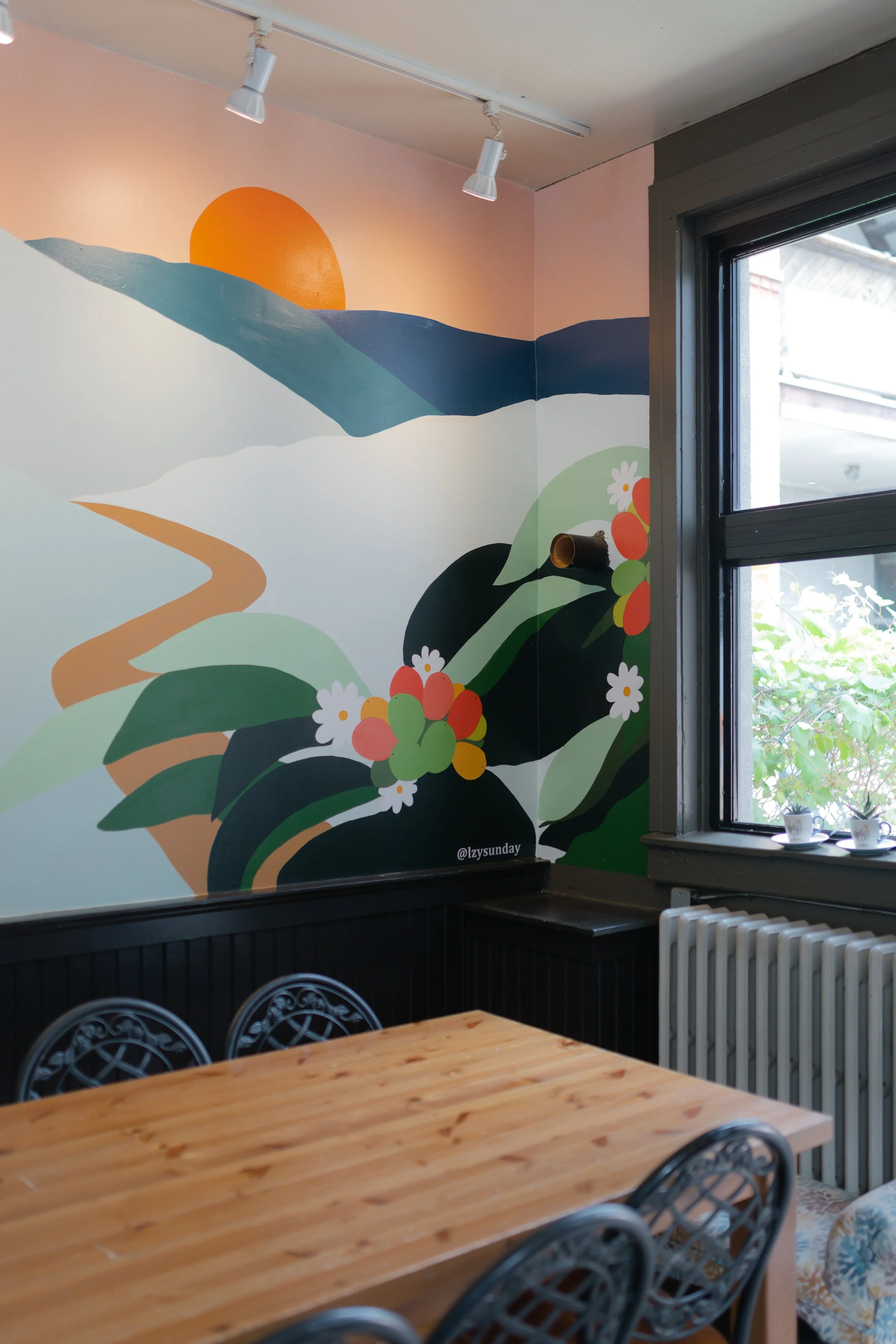 Arlington Five was looking for a mural that would transport their clients to where their coffee originates from. Based off of the mountains in Columbia where the coffee fruit is grown, this mural highlights the colours and landscape of that region and bring it to Ottawa. The coffee fruit is shown at various stages, stages of growth and has many colours throughout its process. The mural wraps around the side wall to the back wall, leading you into their patio garden oasis.