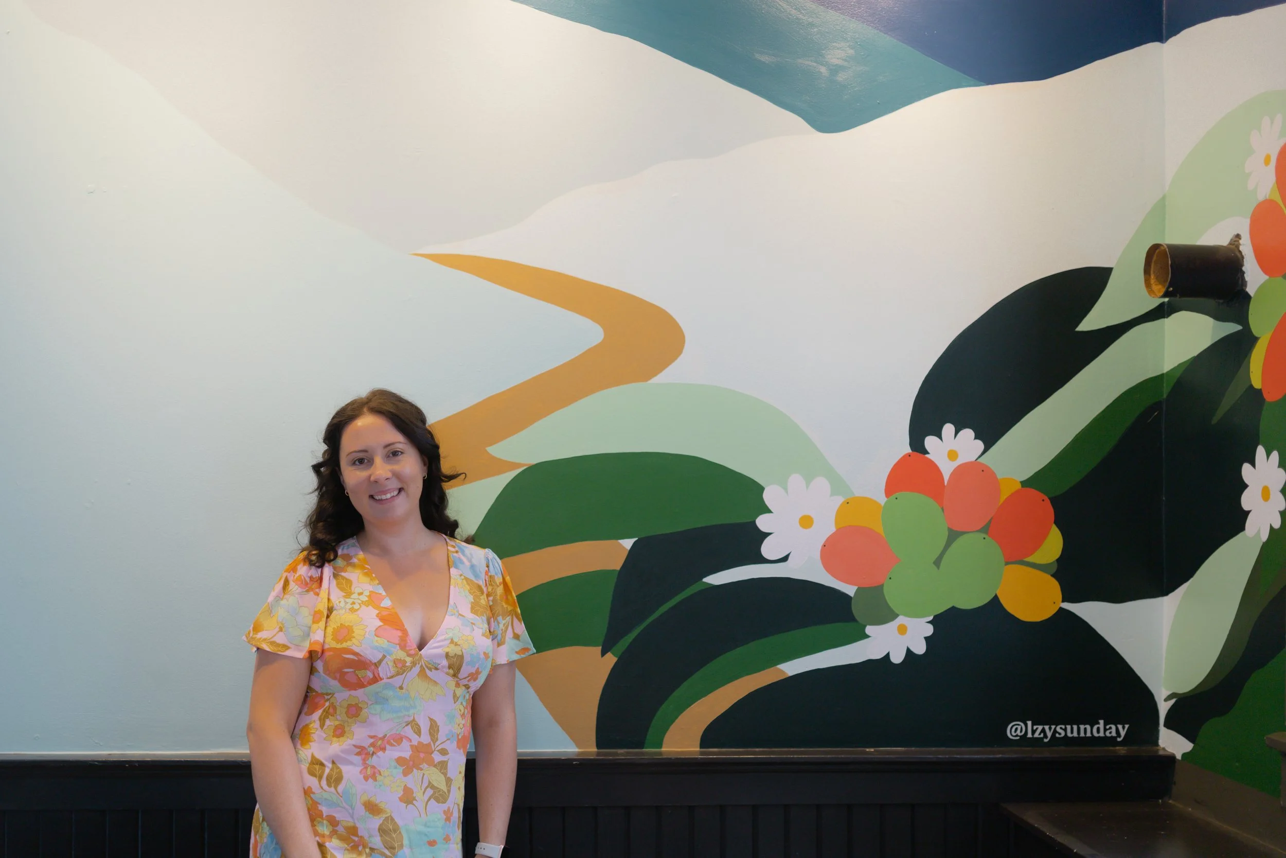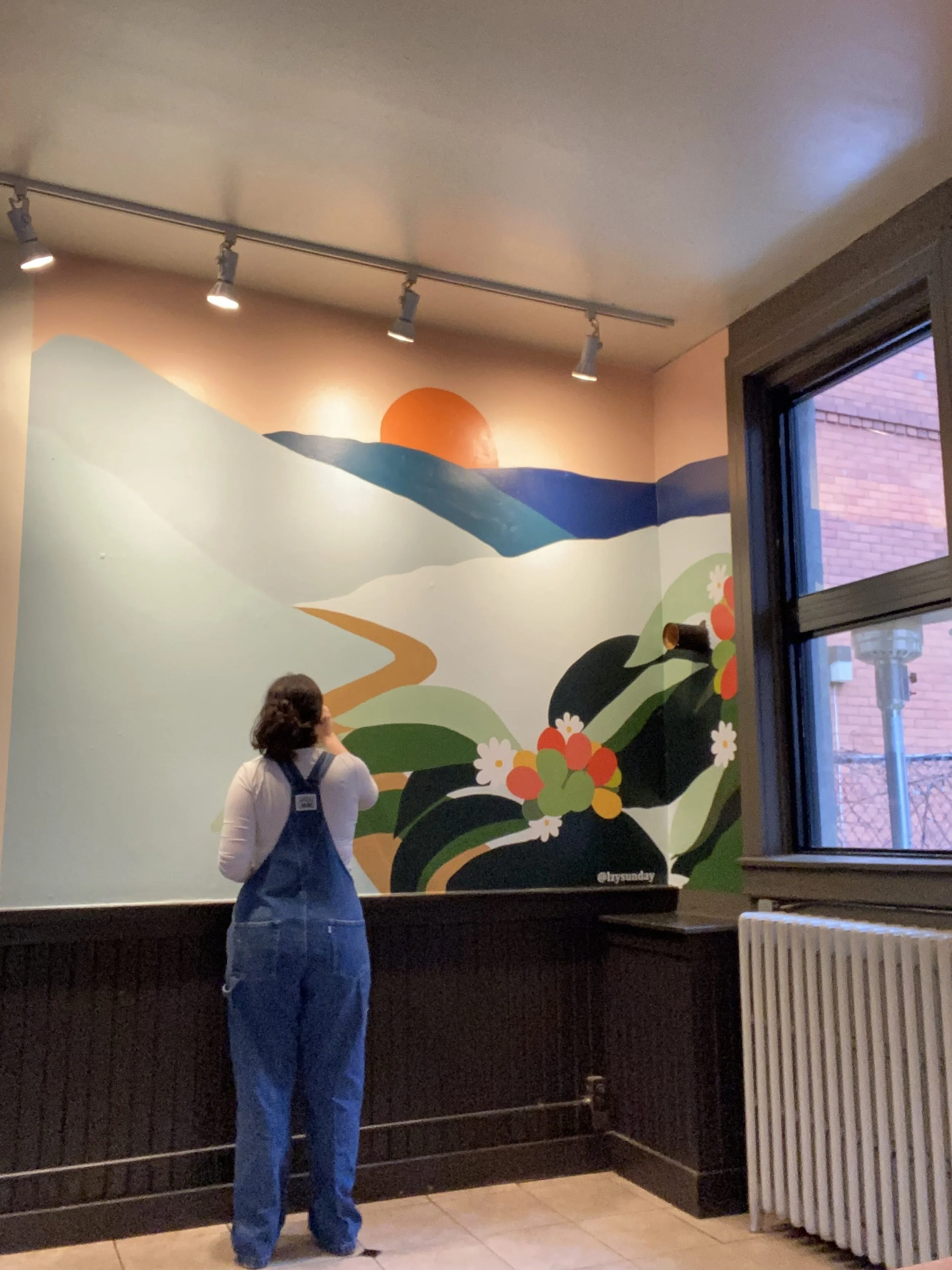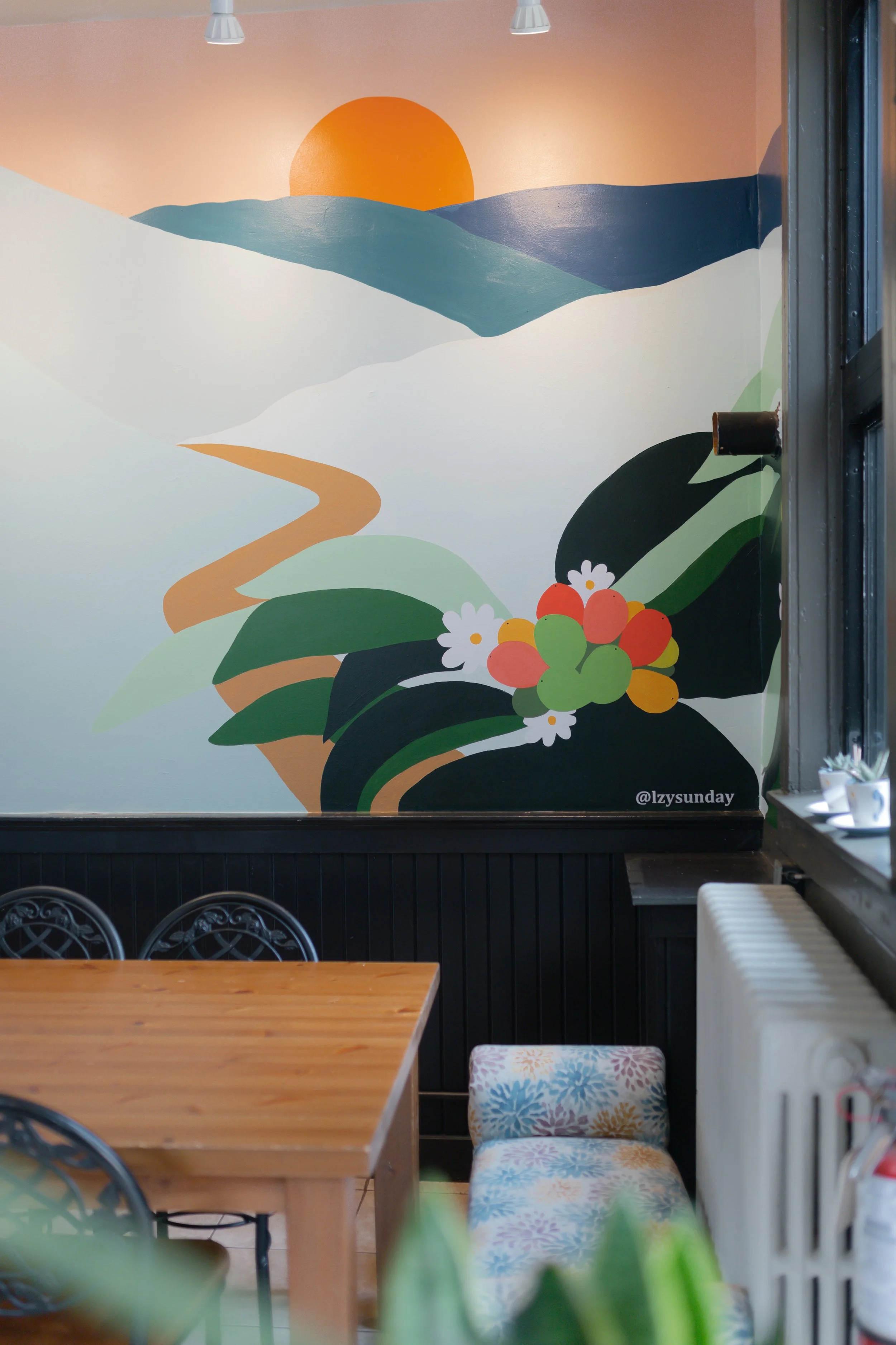 Arlington Five was looking for a mural that would transport their clients to where their coffee originates from. Based off of the mountains in Columbia where the coffee fruit is grown, this mural highlights the colours and landscape of that region and bring it to Ottawa. The coffee fruit is shown at various stages, stages of growth and has many colours throughout its process. The mural wraps around the side wall to the back wall, leading you into their patio garden oasis.
